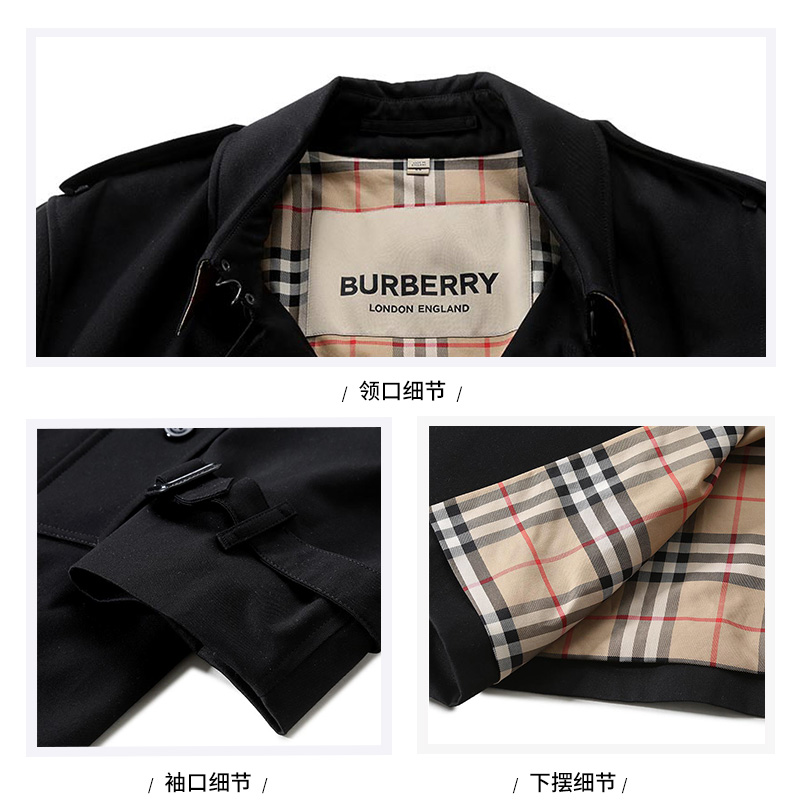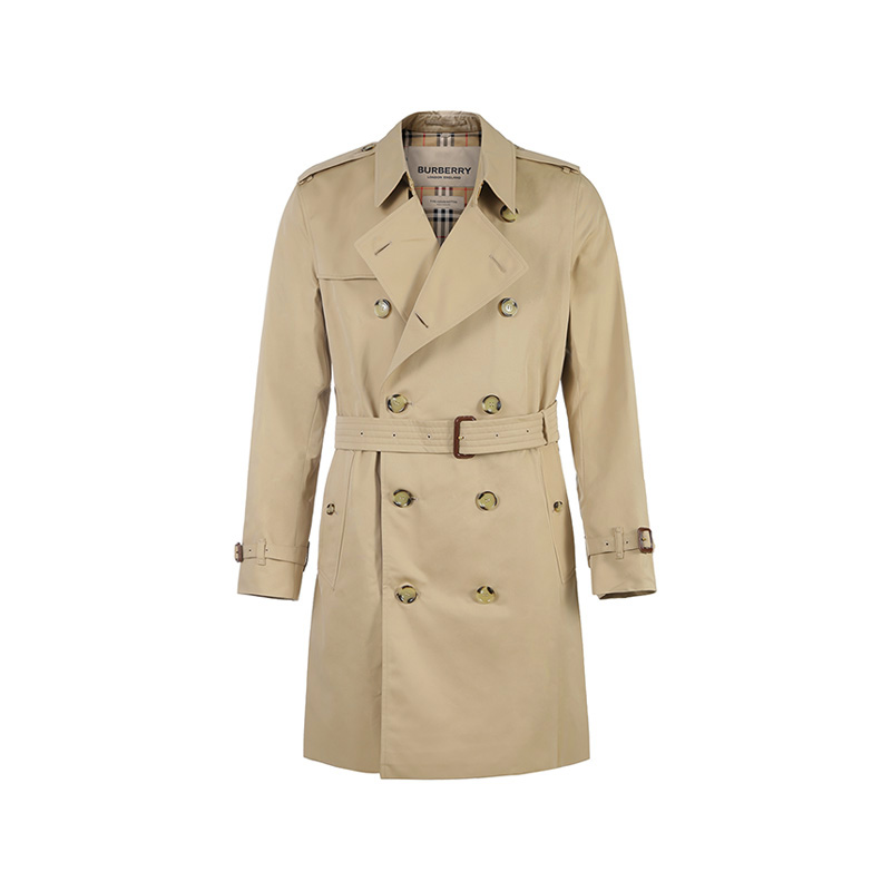 - 标志性 Burberry Trench 风衣,选用防护性棉质嘎巴甸面料打造,于英格兰工坊精制而成。内侧为 Burberry 格纹棉质面料,于 1920 年起便广泛用于品牌外套精品内衬。肯辛顿版型风衣来自 Burberry Heritage 系列,融入嵌入式直袖设计,呈现常规版型。
