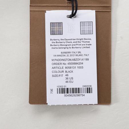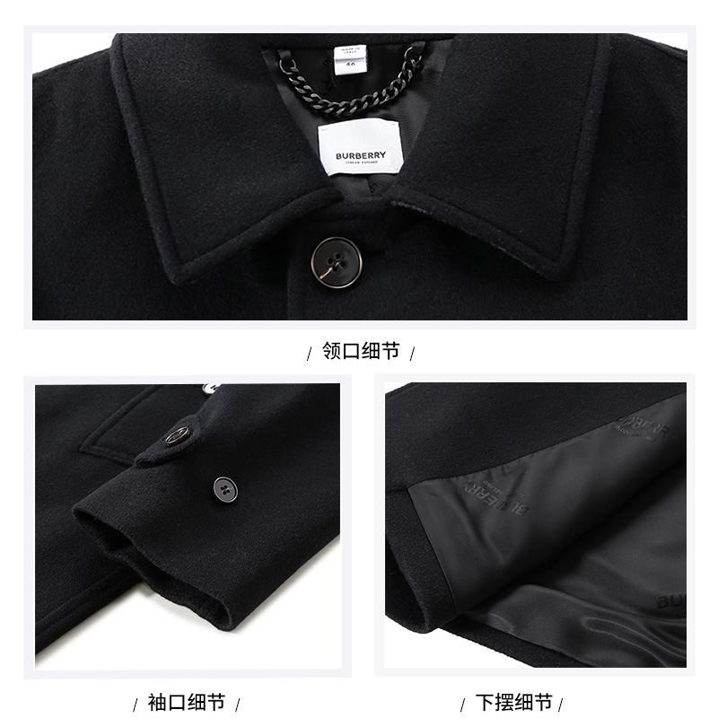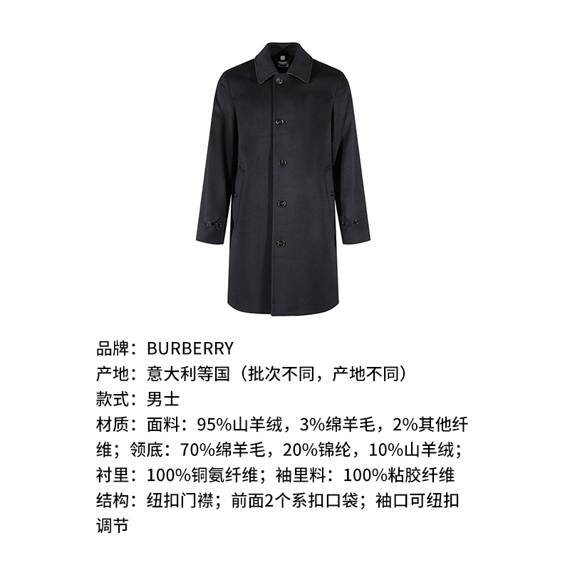自营Burberry 博柏利 男士山羊绒黑色帕丁顿版型单排扣中长款轻便大衣外套 80581311