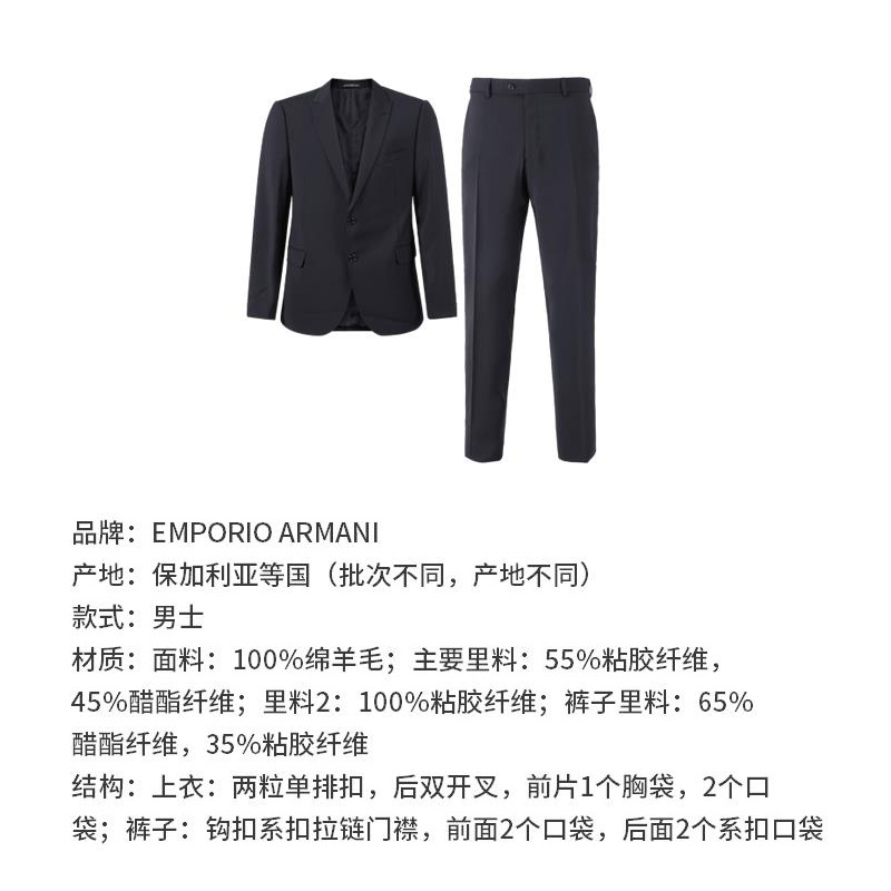 - 材质:面料:100%绵羊毛;主要里料:55%粘胶纤维,45%醋酯纤维;里料2:100%粘胶纤维;裤子里料:65%醋酯纤维,35%粘胶纤维