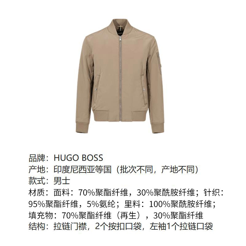 自营Hugo Boss 雨果博斯【新品】 男士black系列褐色徽标小贴饰休闲薄款棉服夹棉夹克上衣外套 50519981 282