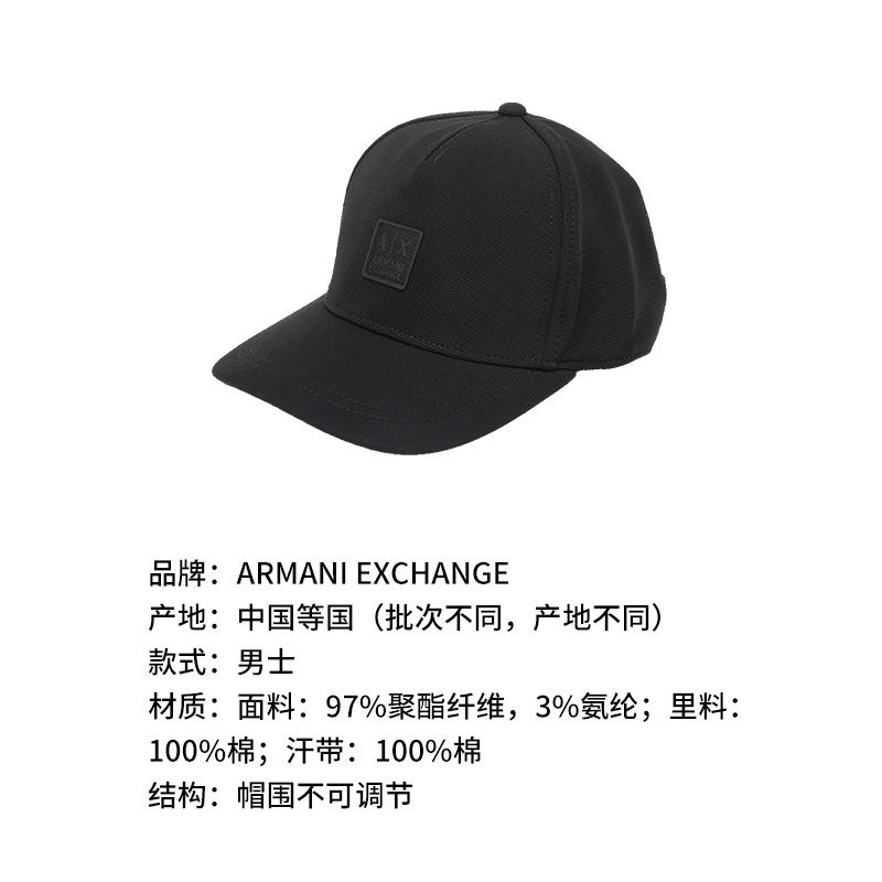 自营Armani Exchange 阿玛尼【新品】 男士织物黑色徽标装饰休闲帽子棒球帽鸭舌帽 954225 4F111 00020