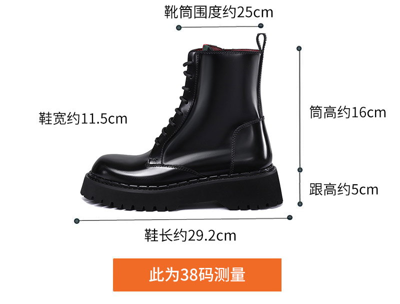 - 尺寸:鞋长约29.2cm,鞋宽约11.5cm,跟高约5cm,筒高约16cm,靴筒围度约25cm(此为38码测量)