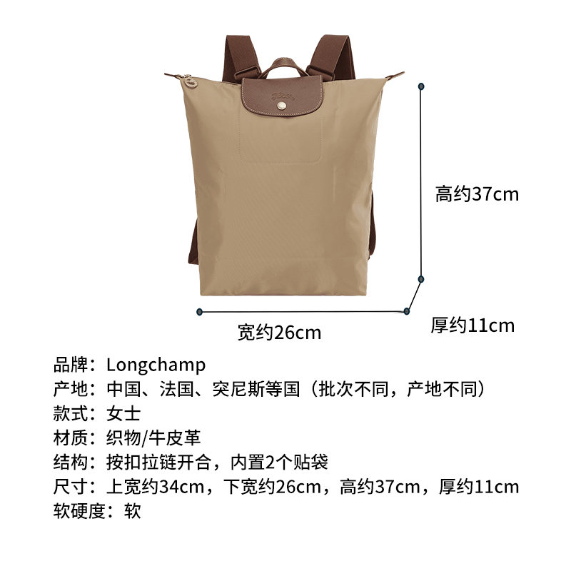 - 这款双肩包采用标志性Le Pliage翻盖扣合,其可调节肩带及可折叠设计,为出行提供便捷。