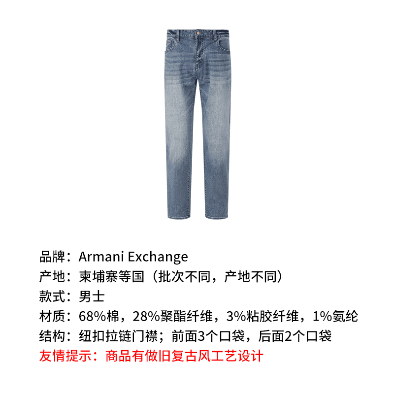 自营Armani Exchange 阿玛尼【新品】男士牛仔蓝色复古牛仔裤长裤 3DZJ13 Z1XBZ 1500
