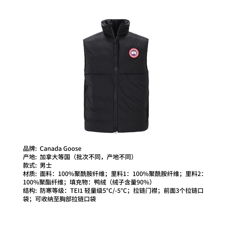 自营Canada Goose 加拿大鹅 新品 男士黑色徽标刺绣Lodge轻薄款鸭绒羽绒立领马甲 4160M 9061